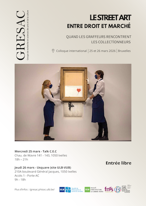 Cette journée d’étude clôture un cycle de trois rencontres autour des nouvelles formes d’art urbain, en particulier le street art, organisées par le GRESAC/ Groupe de recherche en sciences des arts et de la culture à l’ULB/Université Libre de Bruxelles. Après « De la subversion à la subvention : l’art urbain entre pratique illégale et commande publique à l’âge du capitalisme culturel » en 2018 et « Ce que le street art fait au musée. L’institution muséale au défi des nouvelles formes d’art urbain » en 2023, nous programmons « Le street art entre droit et marché. Quand les graffeurs rencontrent les collectionneurs » au printemps 2026. Un ouvrage collectif réunira ensuite les contributions des différents intervenants à la journée, rejoints par d’autres experts ne participant qu’à l’ouvrage, pour achever cette fois le cycle éditorial initié avec (R)évolutions du street art paru en 2021 et (Ex)poser le street art à paraître début 2026 chez CFC-Éditions.