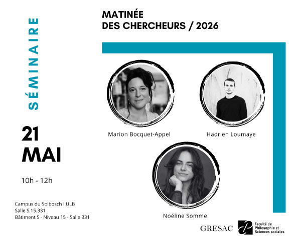 Nous vous proposons de découvrir les travaux menés au GRESAC : des membres de l’équipe présenteront l’avancement de leurs recherches. Nous aurons le plaisir d’assister aux présentations d'Hadrien Loumaye (ULB-GRESAC), de Marion Bocquet-Appel (ULB-GRESAC) et de Noéline Somme (SBSEM, CEBRIG).